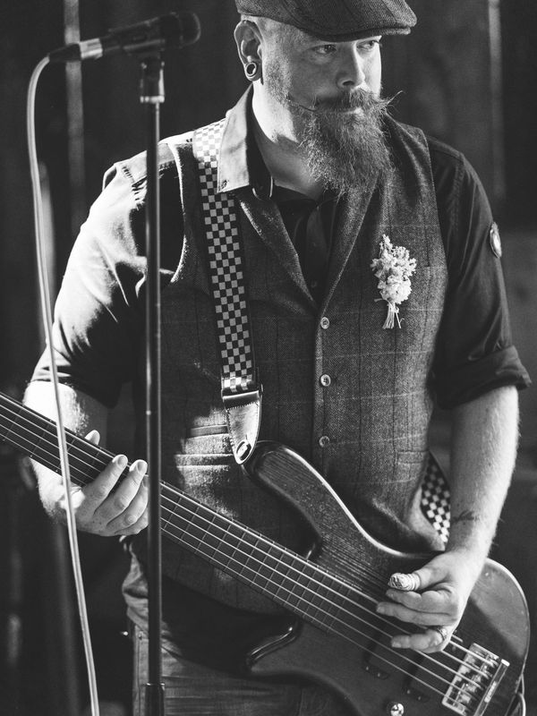 Bloody Nora, where to start? Well the beginning is usually classed as the start so I'll try that. Winter 1980, North Yorkshire. Unbeknownst to parents, doctors or anyone else I was born with major heart defects & underwent a bypass operation at 14 days old, now, the relevance of this is that during the operation I had a stroke which has left me with cerebral palsy in my Left side. I haven't let this define me, but it *does* affect the way I have to do things every day, including painting. (The picture to my left is from my wedding & Im playing bass left handed, this means that my right hand is doing the fretwork & my left (affected) thumb has a pick gaffer taped to it.) In hobby terms this means I prefer to paint things like vehicles etc on turntables because it would not be the 100th time I've had something like an infantry model on a cork in my left hand which has then spasmed for no discernible reason & launched some poor unassuming miniature across the room.